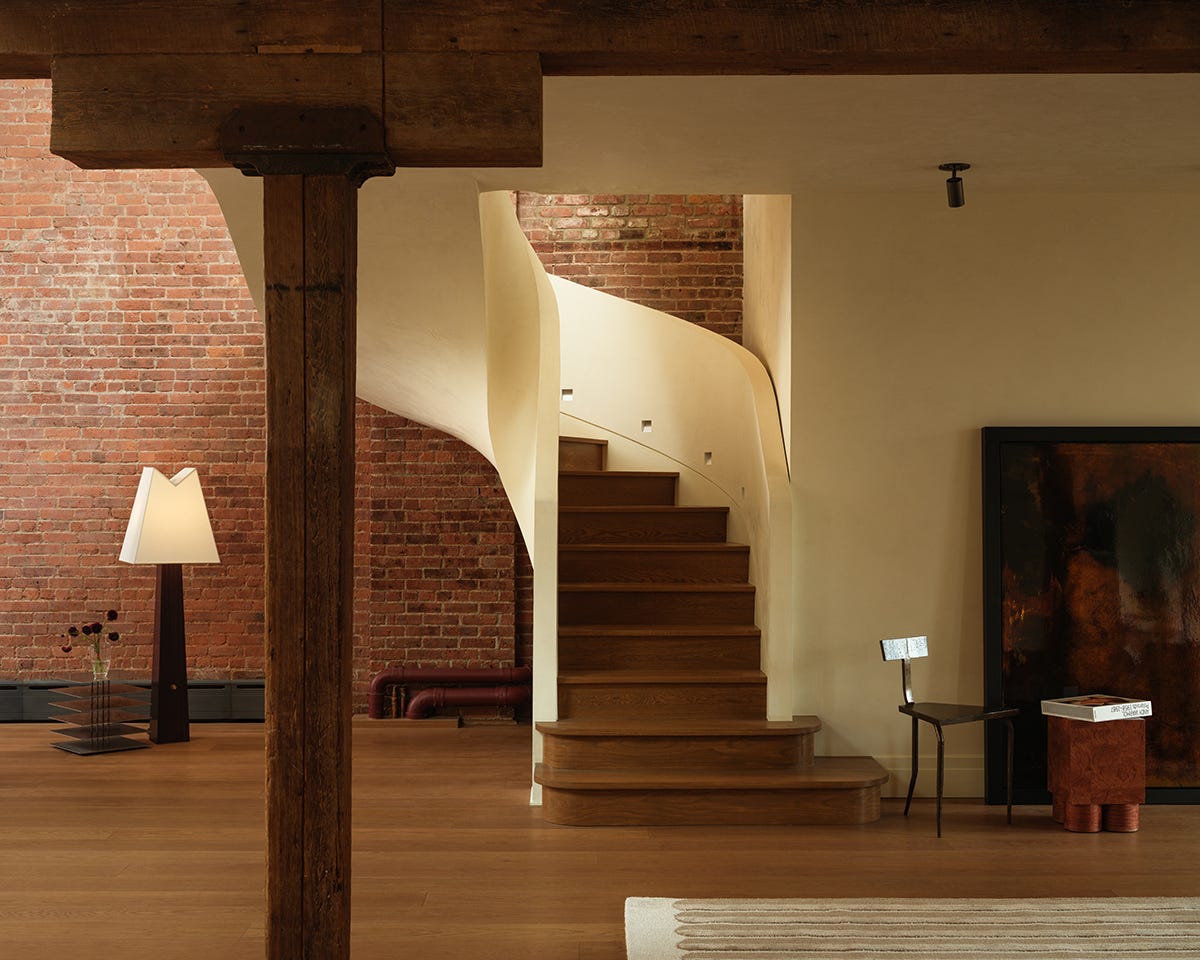 → It has hidden complexity. Texture and pattern are all over this minimalist space: the mortar lines in the brick, the grain in the wood floors and beams, the plaster on the walls and sculptural staircase—in other words, the space is not flat; it has dimension.