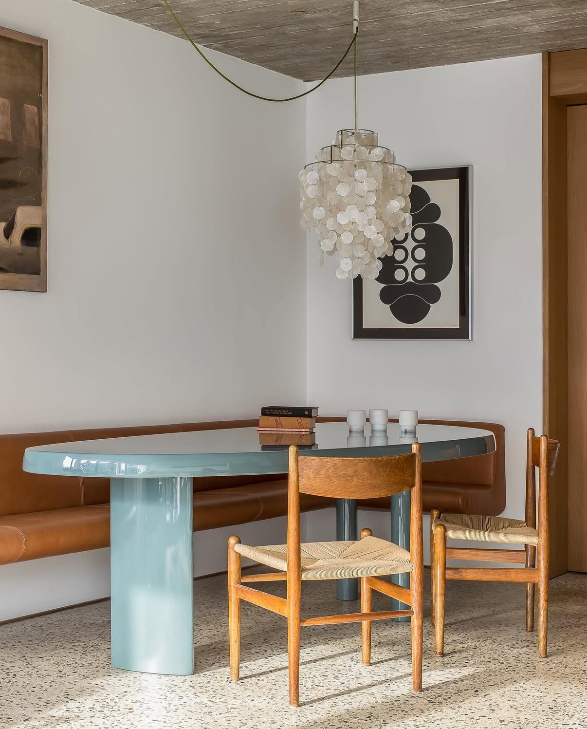 Pictured: The dining room of Seaside Residence JU by dutch firm AID Architecten, where a chandelier is suspended via swag over the dining table, only partially obscuring the art behind.