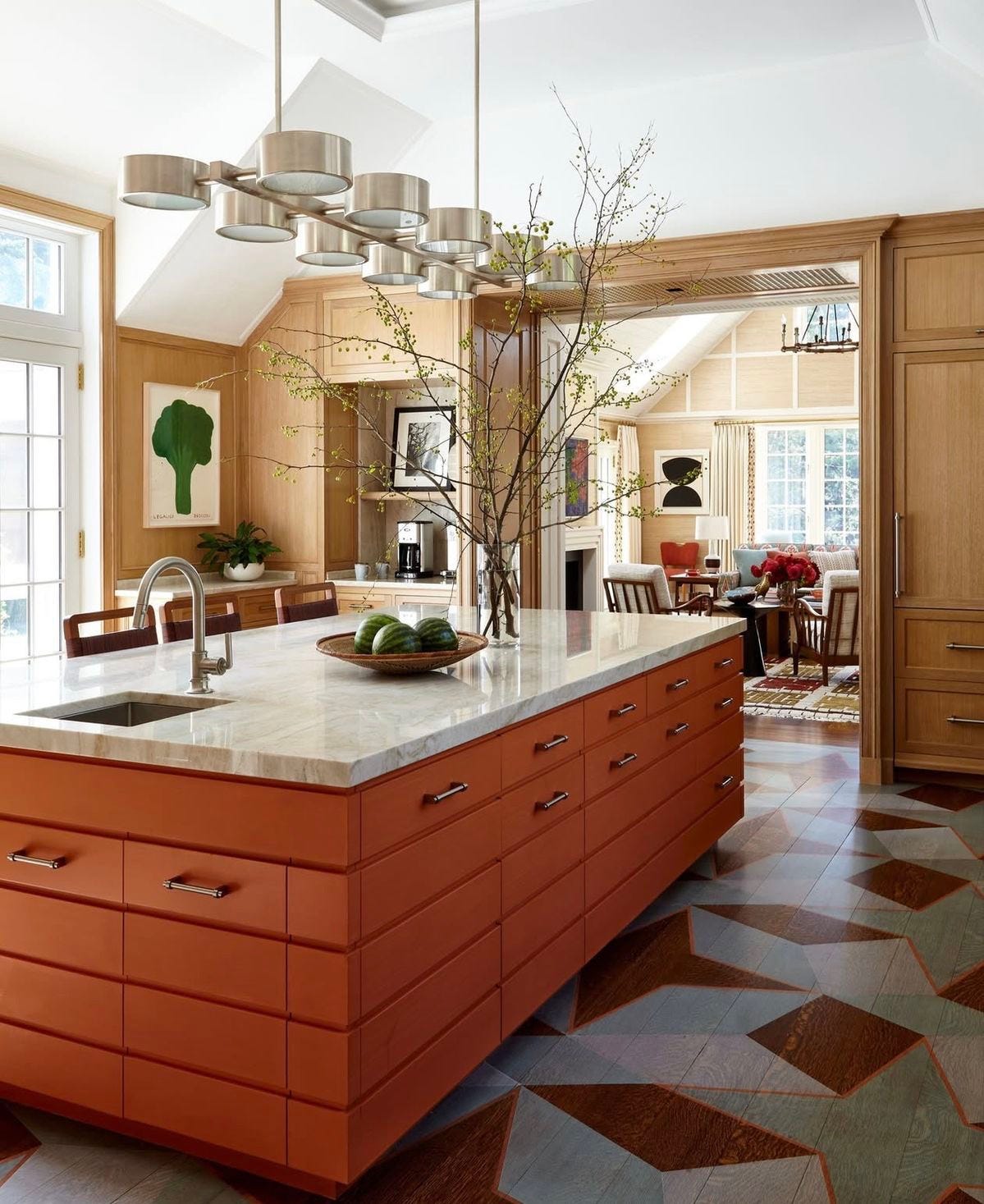 Pictured: The kitchen addition in a Georgian Revival by John B. Murray, Architect, and built by Hobbs inc. The use of brass (door hinges) and nickel (cabinet and drawer pulls) helps to create warmth and lends to the more transitional versus traditional feel of the space.