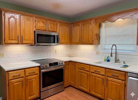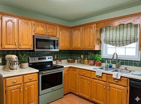 → What is the architecture like in the rest of the home? This is exactly the kind of kitchen I’d expect to find in a 1960s brick ranch in Eastern North Carolina (partial overlay cabinets, exposed hinges, wood valance over the window). It’s been upgraded to a certain point, (the faucet, sink, microwave and oven (and even possibly the backsplash) are dead giveaways that some updating has occurred, but the architecture needs to be acknowledged, which is why the suggestions to go for clearly modern cabinetry feel out of place.