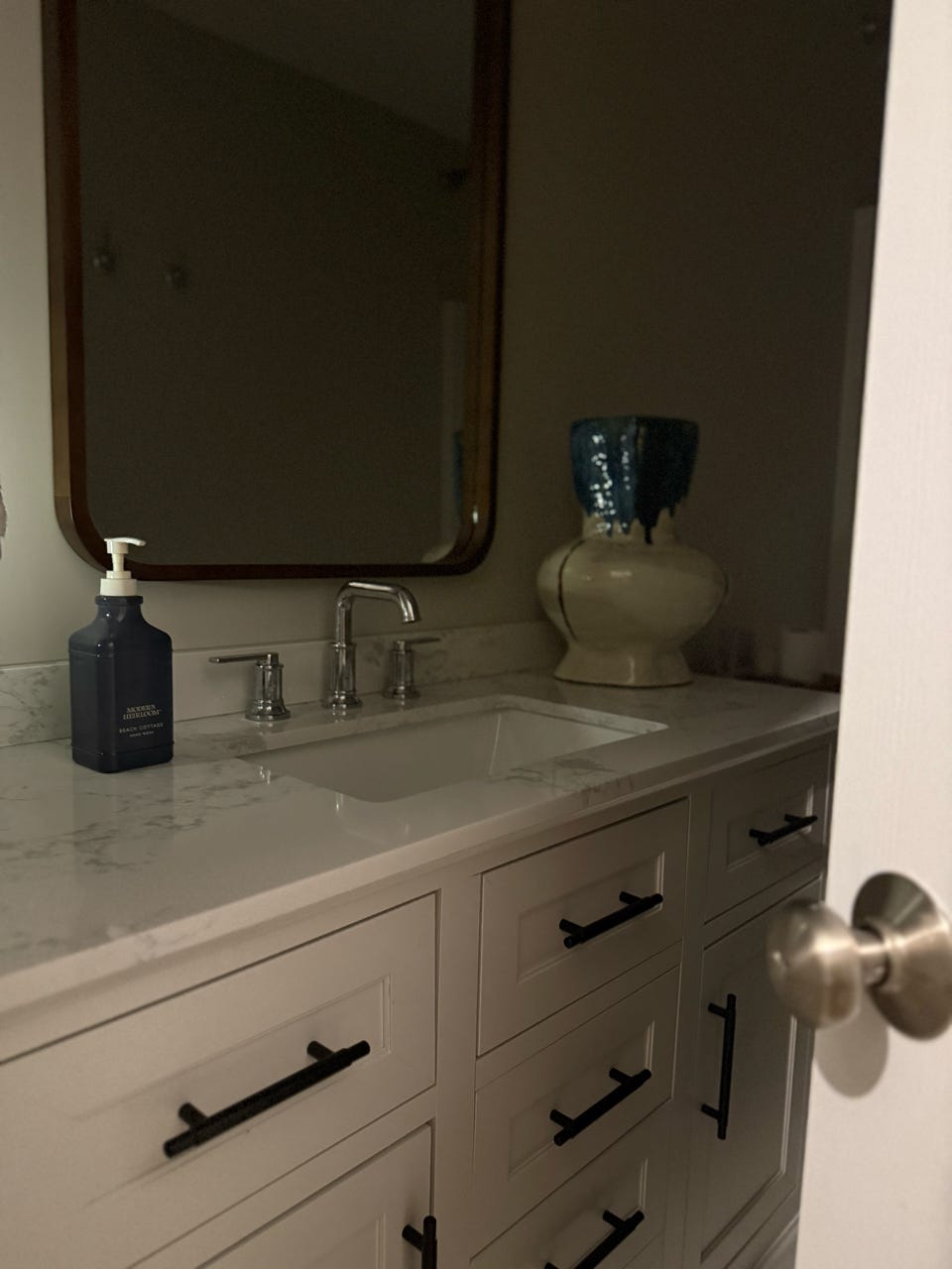 No more movement as yet. We’re on a spending freeze as a family, trying to plan for some big future things and leaning into maintenance mode, so I haven’t ordered anything new for the bathroom (no shower curtain, no new pulls, no new vanity light, no new bath mat— you get the idea). I did think though, with all the following along you’ve been doing, it would only be fair to give you a sneak peek. Let me know what you think!